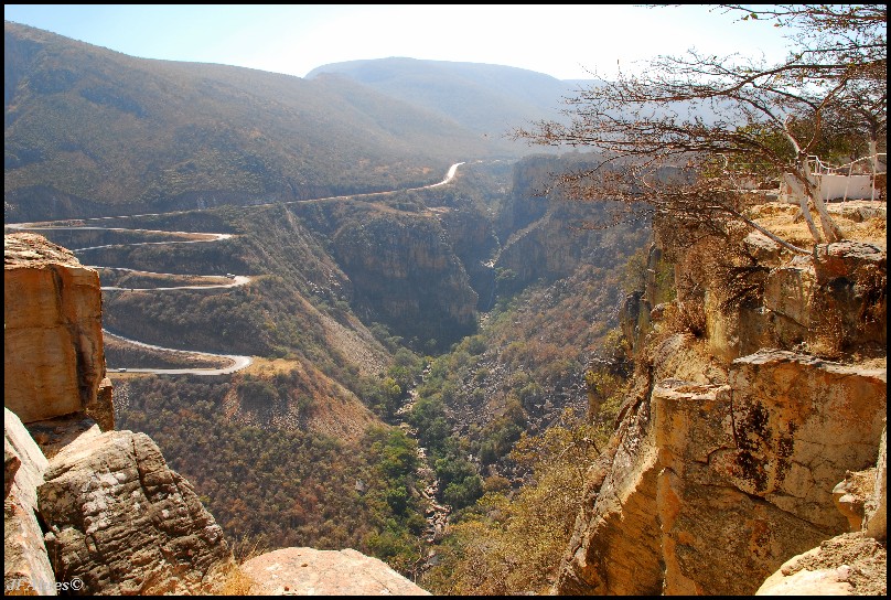 A passagem é feita por uma estreita brecha, por entre aqueles maciços rochosos, numa estrada com curvas em zigue-zague.
