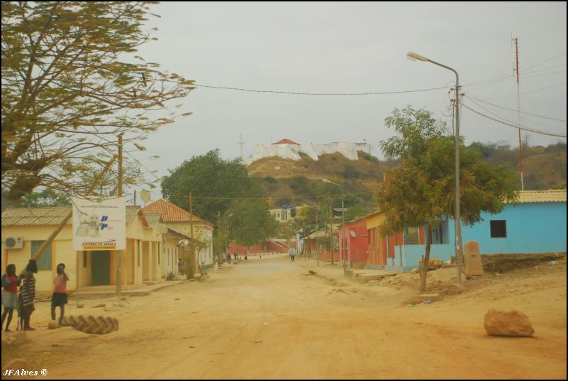 O registo da entrada na localidade de Muxima, atravessando a sua rua principal, com o antigo forte ao fundo, no topo do morro.