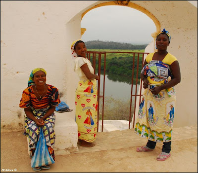 Primeiro, o aspecto visual. Reparem nos trajes das três devotas da fotografia seguinte.